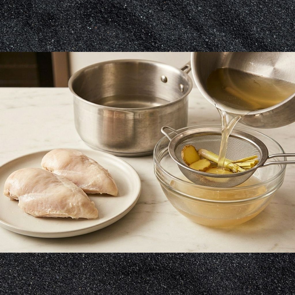 1. Fill a medium saucepan with enough water to fully submerge your chicken. Add 2 slices of fresh ginger, 1 bruised lemongrass stalk (optional but recommended), 1 teaspoon of salt, and bring to a gentle boil.